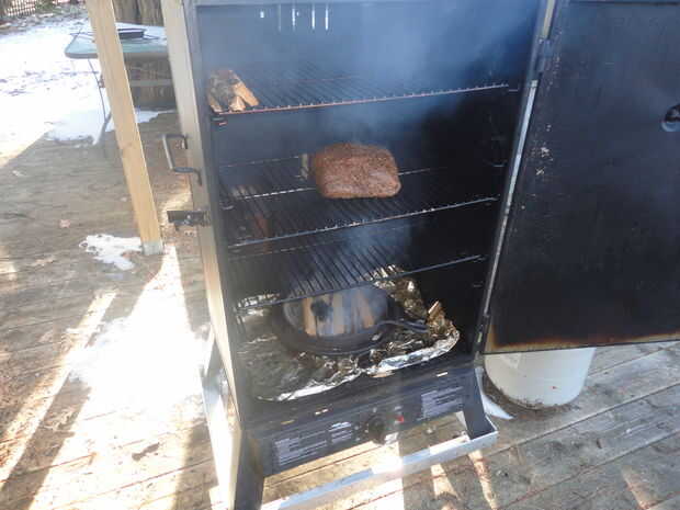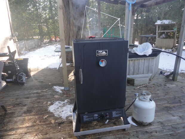 en el fumador. Si no tienes un fumador use la parrilla usando calor indirecto con una bandeja llena de virutas de madera en el lado, funciona casi tan bien. Consigue el fumador hasta 225F entonces añadir su madera o chips, prefiero cherry pero no tengo ninguna así que hoy estoy utilizando abedul. Asegúrese de que quita cualquier corteza. Sí ves nieve, hoy sólo era 23 * F