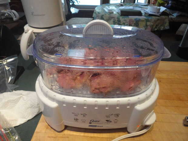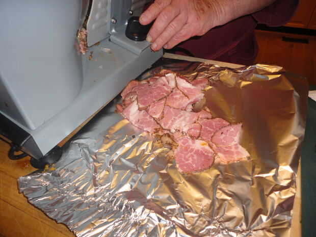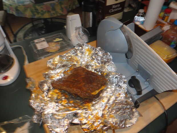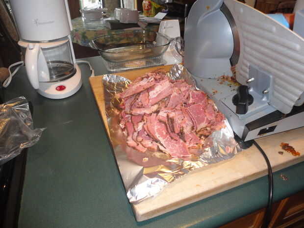 Ahora quieres comer este derecho?? Esto es lo que hago al día siguiente desde máquina de cortar del havea. Cortar la carne alrededor de 6 oz hace un gran sándwich y sí sigue siendo frío. Cortar tanto como usted desea en el momento. No cortar, no hay problema, obras de un cuchillo afilado... Último paso, promesa. La carne debe cocinarse al vapor, no micro ondulado. Vapor añade humedad, microondas reseca. Tenemos un vapor de arroz, funciona perfecto o uso una cacerola con un poco de agua en él, cubierta con un pedazo de papel de sangría y coloque la carne pulgadas cubierta con la tapa.