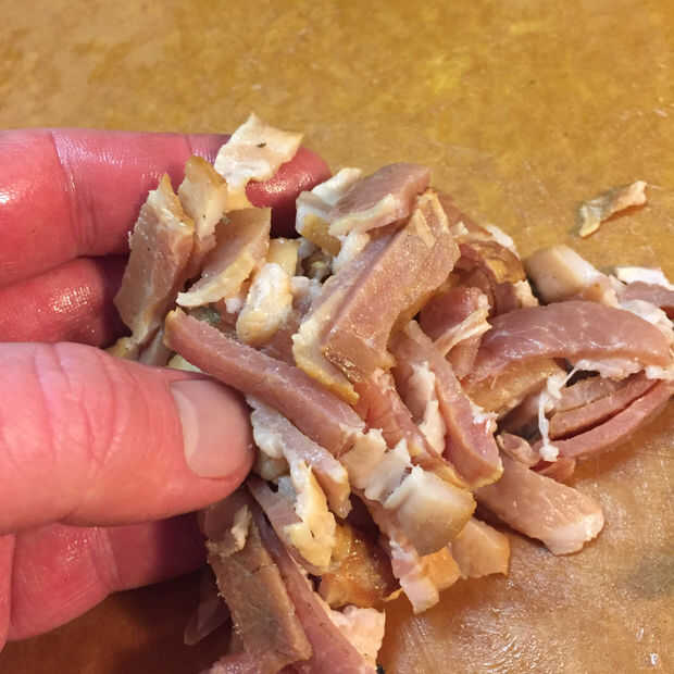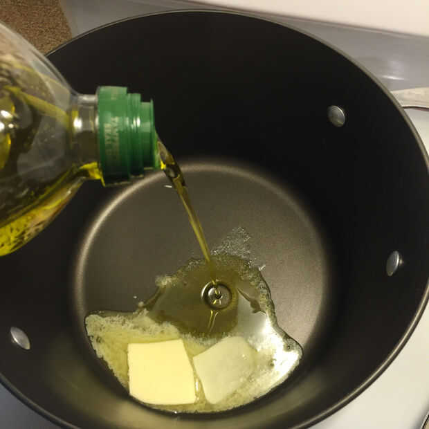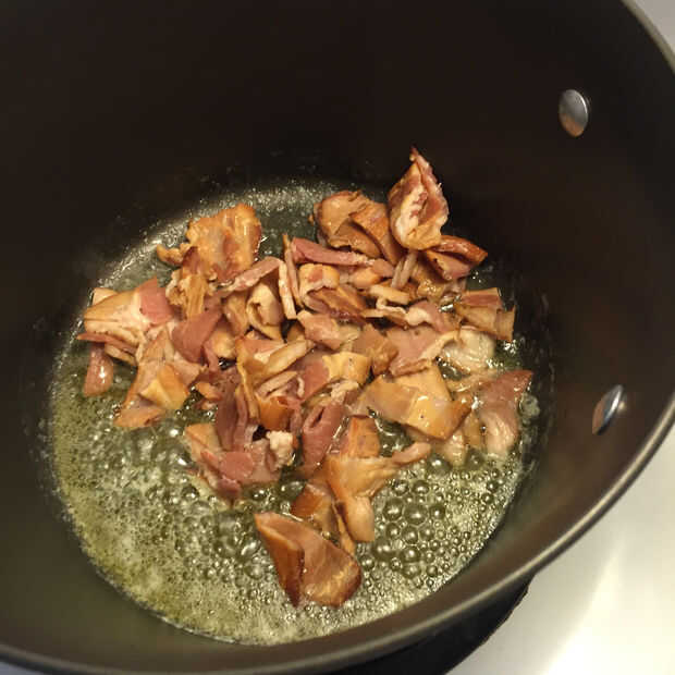 Paso 1 - en una olla grande agregar algunos mantequilla 2tbs 2tbs de aceite sobre fuego medio alto. Aproximadamente picar el bacon y añadir a la olla y