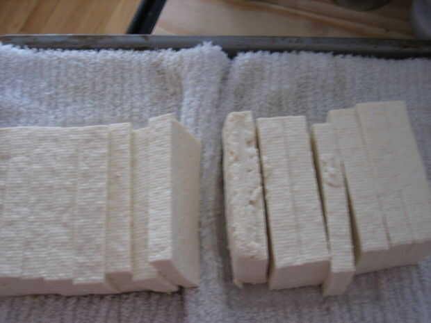 1. Coloque una toalla sobre una de las cacerolas de la hoja y coloque el tofu en él