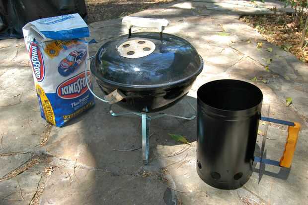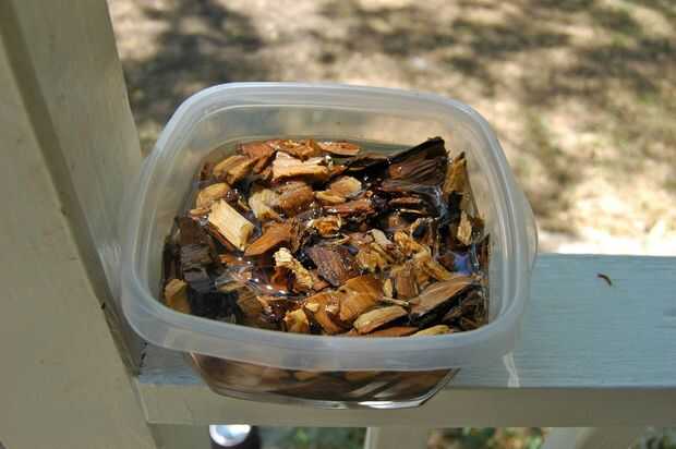Lanzamiento de su virutas de madera de en un recipiente con agua durante unas horas por lo que realmente se lo fuman cuando es hora de poner en el fuego. Me gusta usar una mezcla de trozos grandes y pequeñas virutas. Estoy usando virutas de nuez, porque vivo en Texas y mi jardín está lleno de ramas, pero esto funciona con cualquier madera de fumar.