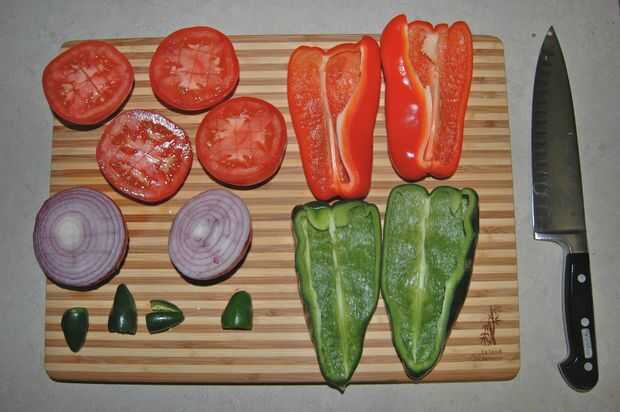 Cortarlas en trozos grandes, generalmente en medio a trabajar. Para la cebolla y el tomate, me gustaría anotar en la parte superior con un patrón de tablero de ajedrez rápido para ayudar a conseguir humo interior hacia abajo.