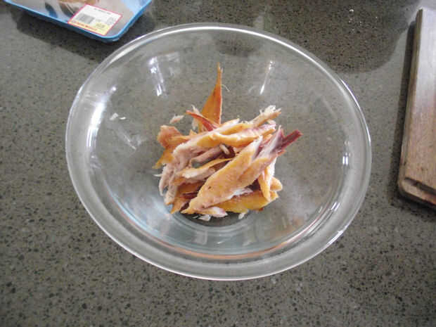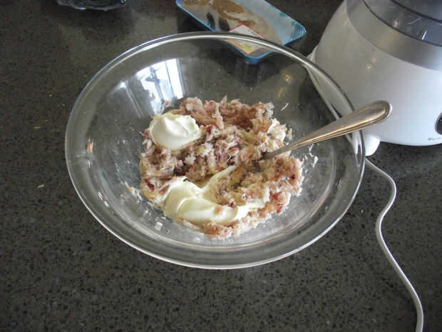 este es un muy simple avena para el desayuno. Esto también puede ser una buena comida antes del ejercicio.Lo que usted necesita:Un tazón de fuentetaza de avena o 1 dl1 plátano2 cucharadas de Queso Cottage1 cucharada de paté de hígado1 cuchilloLecheCa