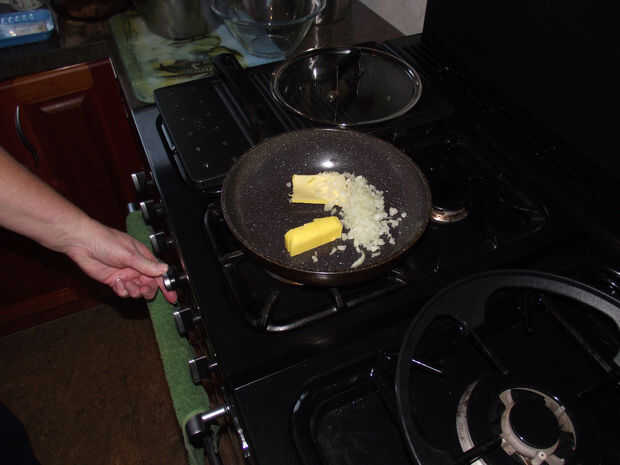 Finalmente picar la cebolla y cocinar en sartén con 1 oz (30g) de mantequilla, no permita que a brown, que sólo es ablandamiento lo.