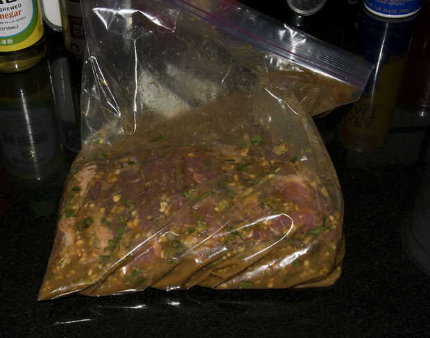 Empezar a trabajar el adobo en las costillas, frotar el exterior de la bolsa, asegurándose de que todo es éxito. Hacer esto durante 4-5 minutos. Arreglar cosas en el bolso para que la máxima cantidad de área superficial está expuesta a la marinada y luego meter la bolsa en el refrigerador por un mínimo de una hora, hasta un máximo de seis. Creo que el adobo es demasiado fuerte como para dejar toda la noche, YMMV.