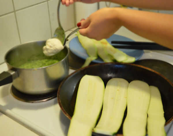 Cortar el calabacín en rodajas finas. Freírlas por ambos lados hasta que se vuelvan más suaves. Mientras tanto Cocine las espinacas (yo usé espinaca congelada) y añadir las verduras congeladas. Agregue sal y pimienta. Agregue vino y queso de ricotta 1 cucharada completa, como se muestra en la foto.