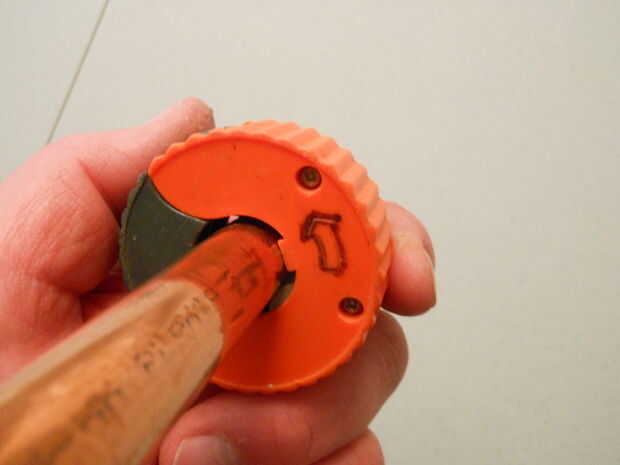 Opción B: Si eres la suerte de tener un poco naranja cortador de pipa en la segunda foto, solo abrirlo, fijarlo con la abrazadera sobre el tubo en la marca de la pluma de 1". Gire la cuchilla en la dirección indicada en el cuerpo del cortador de la pipa por una flecha (solo Gire esta dirección cortador) hasta que ha cortado totalmente a través del tubo. Tan fácil.