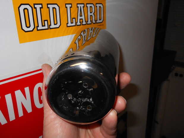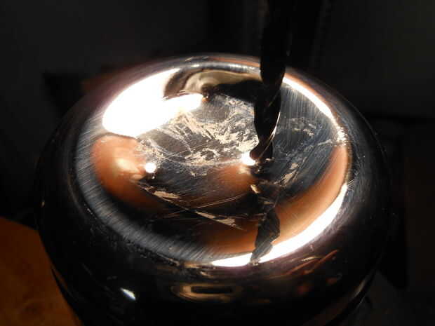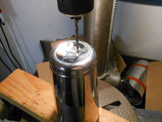 Usando un taladro de columna (la forma más segura) o un taladro de mano, mantener el agitador mientras taladra 1/8"* agujeros en su parte inferior. Gafas!