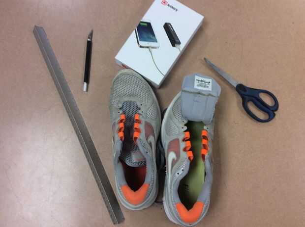 El primer paso trata de recopilación de todos sus materiales. Usted necesitará un par de zapatos con suelas de una pulgada de altura en la parte posterior del talón. Recomendamos la Nike lunareclipse 2s. Usted también necesitará un par de tijeras, dos cuchillos de exacto, un cargador portátil mini jackery y un rotulador.