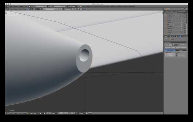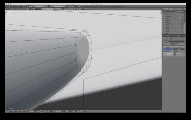 Este es el pequeño orificio al final del avión. Llenar en el bucle de borde al final. Lo de la inserción y utilizando el complemento de LoopTools , convertirla en un círculo. Saca eso hacia el interior y endurecer los bordes con unos lazos de proximidad.