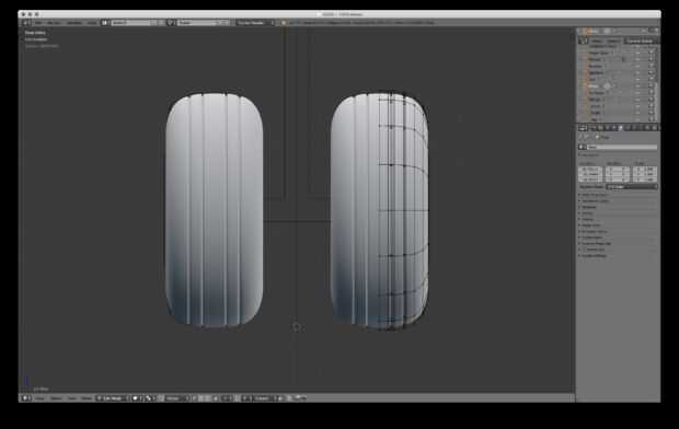 Empezaremos con la parte más rápida del tren de aterrizaje, los neumáticos. Comience con un cilindro y se alinean con los planos. Ahora dar sombreado suave y un modificador de superficie de subdivisión. Voy a usar un modificador espejo aquí también, notar en la imagen tengo dos modificadores de espejo, los espejos de un superior la mitad de la malla en su propio origen, el otro refleja todo al origen del cuerpo. Esto facilita las cosas mucho, vamos a usar esto otra vez cuando hacemos un modelo del tren de aterrizaje trasero. Ahora se parece probablemente bastante flojo. Añadir algunos más bucles de borde y completar la forma general. Ahora agregue dos lazos del borde y bisel con 1 segmento, esto creará dos lazos del borde de cada uno original. Sacar estos y escala abajo, estos conforman los pequeños bosquetes en los neumáticos. Duplicar el neumático que usted acaba de hacer (para el resto de los neumáticos) y Coloque estos sobre el plan de acción.