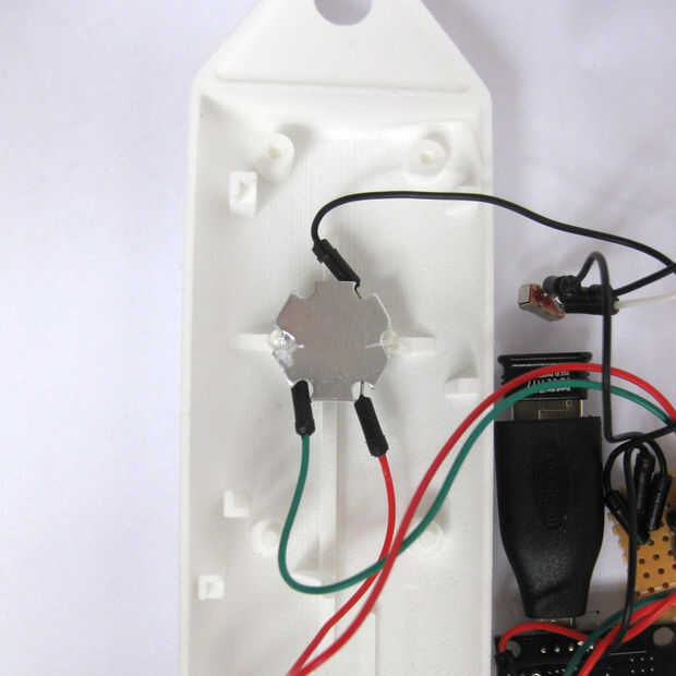 Ranura de lo LED en las lengüetas en el recinto y la pistola de pegamento caliente en su lugar.