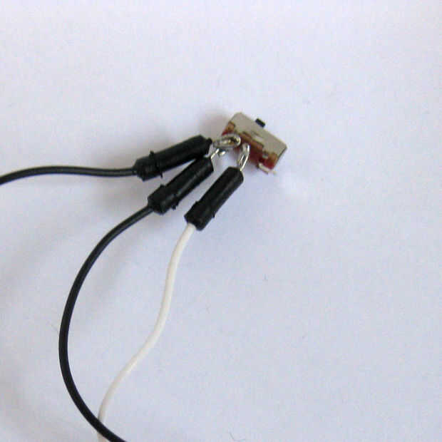 Doblar una de las patas fuera del interruptor de SPDT. No se utilizará la pierna doblada. Agarra dos cables de puente negro y uno blanco. Utilizando unas pinzas, enganche los extremos antes de soldar como se muestra.