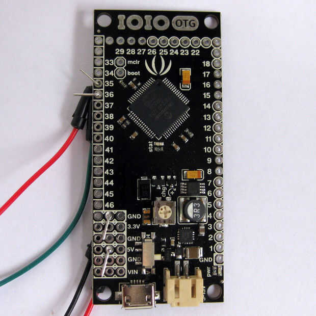Agarra dos cables de puente rojo, uno negro y uno verde. Inserte el cable de puente rojo pin 35 del IOIO, enganche el extremo con unos alicates y soldar en su lugar. Inserte el cable de puente verde pin 36, enganche el extremo con unos alicates y soldar en su lugar. Inserte el cable puente negro en el pin del centro de la fila de tierra (GND), enganche el extremo con unos alicates y soldar en su lugar. Inserte el segundo cable de puente rojo en el pin central de la fila de 5V, enganche el extremo con unos alicates y soldar en su lugar.