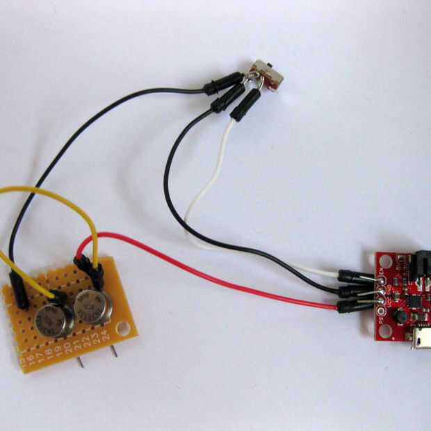 Tome el interruptor, la placa y el cargador Li-Po. Inserte uno de los cables negro funcionamiento del interruptor en el protoboard, doblar la pierna para que quede a ras con el tablero y lo de la soldadura. Inserte el otro cable negro de corriente del interruptor a tierra (GND) del cargador de Li-Po. Doblar la pierna para que quede a ras con el tablero y lo de la soldadura. Inserte el cable blanco que desde el interruptor el pin enable (EN) en el cargador Li-Po. Doblar la pierna para que quede a ras con el tablero y lo de la soldadura. Inserte un cable de puente rojo en la clavija de 5 voltios (VCC) en el cargador Li-Po. Doblar la pierna para que quede a ras con el tablero y lo de la soldadura. Coloque el otro extremo del cable rojo en el pasador de placa más cercano al cable del puente amarillo. Este es el cable amarillo que está al lado del transistor que está más cercano del borde del tablero. Doblar la pierna para que quede a ras con la placa y soldar el cable amarillo y el transistor.