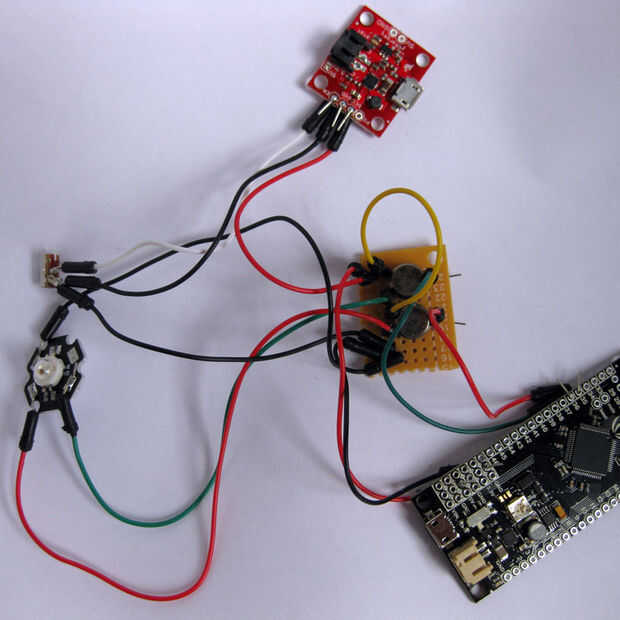 Inserte el cable negro que va desde el LED en la clavija de la protoboard junto al cable negro de corriente desde el interruptor. Doblar la pierna para que quede a ras con la placa y soldar otro cable negro. Inserte el cable verde que va desde el LED en el tablero al lado del transistor que está más cercano del borde del tablero. Asegúrese de insertar a través de la clavija de la protoboard junto a la lengüeta metálica de transistores. Luego doblar la pierna para que quede a ras con la placa y soldar a la pata del transistor. Insertar el cable rojo va desde el LED en el tablero al lado del otro transistor. Asegúrese de insertar a través de la clavija de la protoboard junto a la lengüeta metálica de transistores. Luego doblar la pierna para que quede a ras con la placa y soldar a la pata del transistor.
