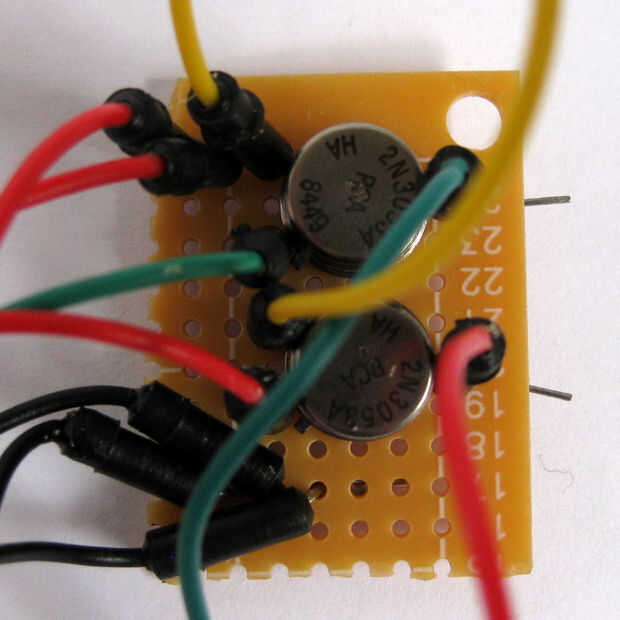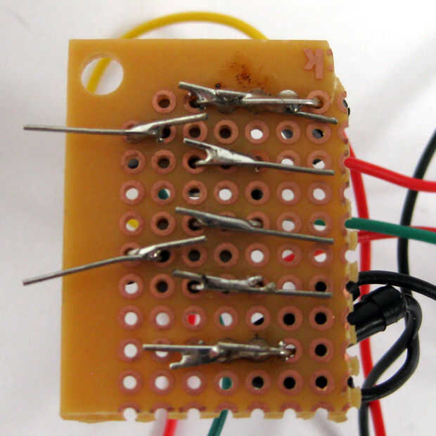Inserte el cable de puente rojo corriente del pin 35 del IOIO en el protoboard a la derecha del transistor, como se muestra. Luego doblar la pierna para que quede a ras con la placa y soldar a la pata del transistor. Inserte el cable verde que se ejecuta desde el IOIO en el protoboard a la derecha del transistor, como se muestra. Luego doblar la pierna para que quede a ras con la placa y soldar a la pata del transistor. Inserte el cable negro que va desde el IOIO en el agujero de la placa más cercana de los otros dos cables negro. Luego doblar la pierna para que quede a ras con la placa y soldar a los otros dos cables negros. Inserte el cable rojo va desde el IOIO en la esquina superior izquierda de breadboards, como se muestra. Luego doblar la pierna para que quede a ras con la placa y soldar a sus vecinos (rojo, amarillo y la pierna).