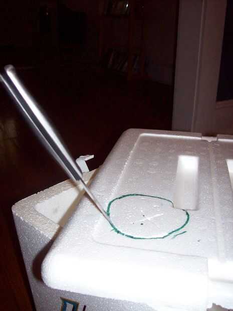 Lo que estamos haciendo aquí es la Corte orificios en la tapa para los fans. Me pareció más fácil para mantener la tapa corte de esa manera todos los bits de espuma de poliestireno cayó en la parte inferior de la nevera y era más fácil para limpiar.
