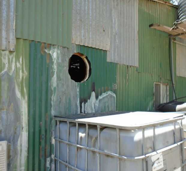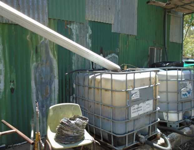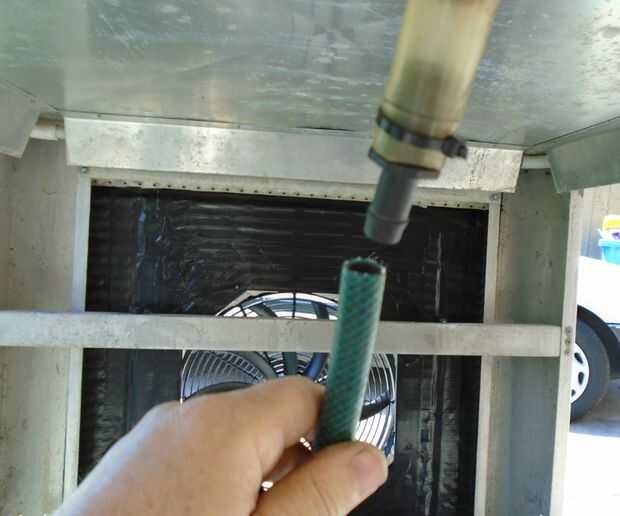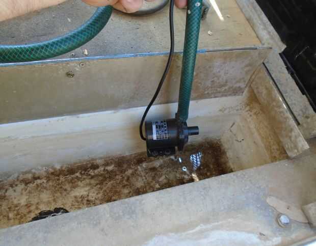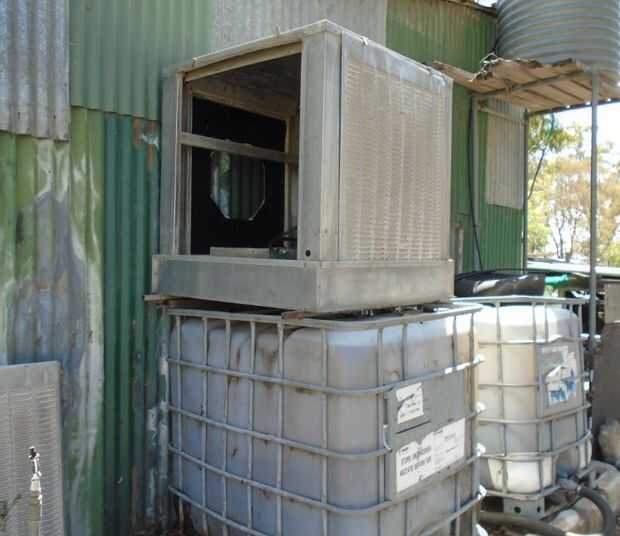 Después de muchas maldiciones en el calor de 40 grados el agujero finalmente fue cortado y la unidad fue en el contenedor IBC. La bomba de 12 voltios fue abandonada en la parte inferior de la IBC y la manguera conectada a la tubería que envía agua a los cojines. El desagüe de la unidad fue conectado al it va detrás en el tanque IBC