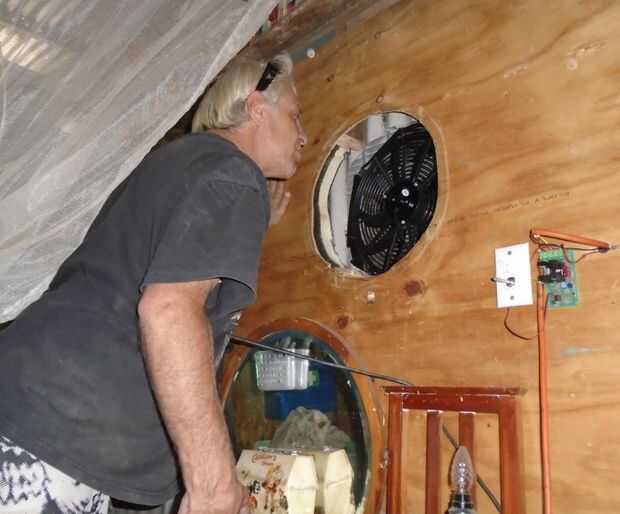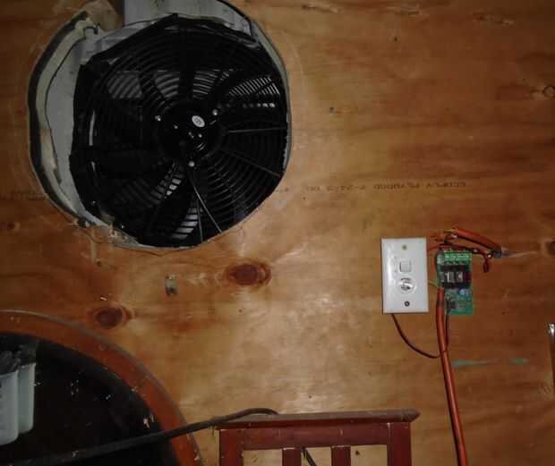 El cableado del controlador de velocidad y el interruptor conectados y conectados con el Banco de baterías de 12 voltios. El sistema fue encendido y pronto soplaba aire fresco en el interior. Uno de los problemas con 12 voltios es la caída de voltaje a distancia, por lo que el ventilador era sólo alrededor de 7 voltios por el Banco de baterías fue unos 12 metros de distancia. Así que el ventilador no móvil como mucho aire como se esperaba, así que dio al residente la opción de cualquiera de los dos uso pesado cableado, o poner una batería cerca de la unidad y conexión de un panel solar que.