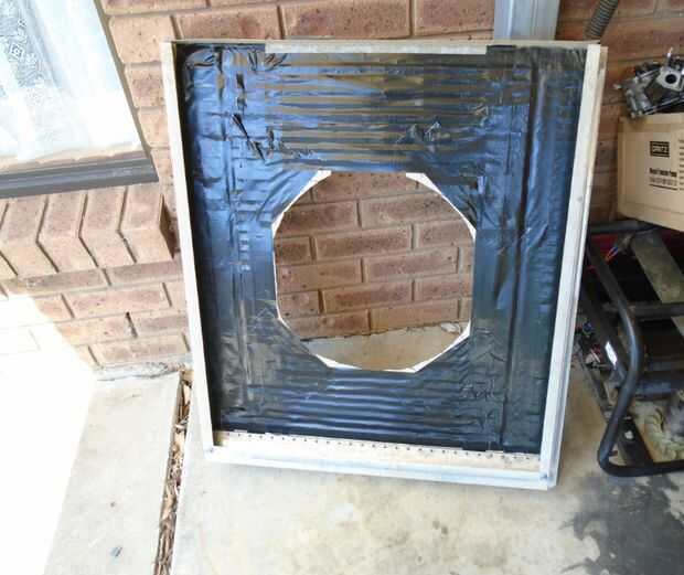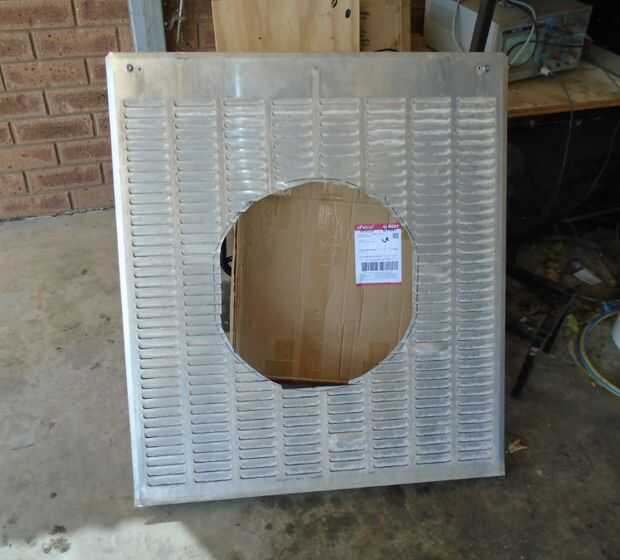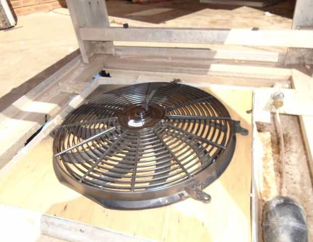 El ventilador fue cabido en el lado de la unidad, pero no hay razón por qué no podía colocarse en la posición original de inferior. Uno de la almohadilla fue quitado de su tapa y un orificio cortado con tijeras. Las persianas luego fueron aplanadas hacia fuera con un martillo y un bloque de madera y el interior sellado con cinta de celo. El ventilador fue unido a la cubierta con tornillos tek a continuación montado en la unidad de con aire.