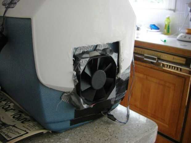 Después pegué los ventiladores en los agujeros utilicé un poco de pegamento caliente y cinta para mantenerlos en su lugar, junto con algunos burletes de aislamiento e impermeabilización.