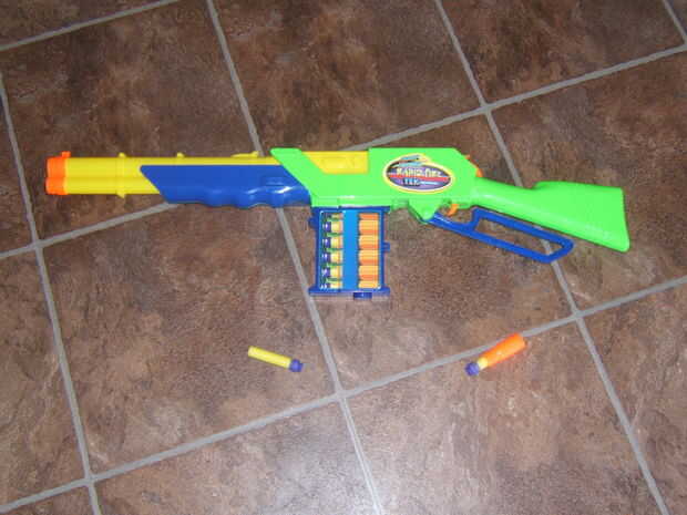 Este instructable le dirá cómo hacer su doble arma de tiro a fuegopequeñas bolas o barras aún verdes de KVG.Todo lo que necesita:Nerf dardos de tm.Tm de blaster Shot doble de aireConchas para la pistola.Una paja gruesa que apenas cabe la cáscara.(Deb