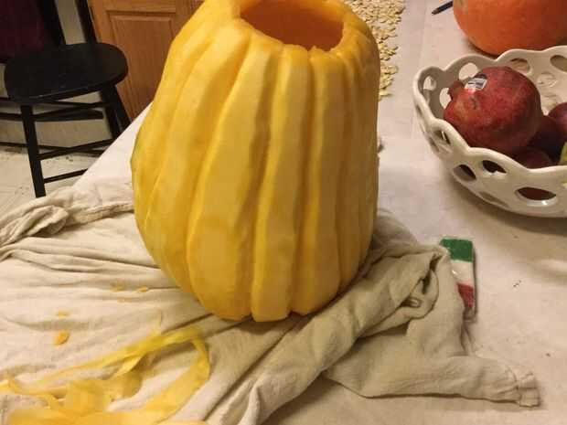 Después de que ha dado forma a los paneles de donde quieres, te aconsejo usando su policía para quitar de la capa más externa de la calabaza porque en este momento debido al peso del mismo habrá herido la calabaza un poco. Cuando tienes todo lo que busca la forma que desee, spray o limpiar la calabaza en una solución que es una parte de lejía por diez partes de agua (esto ayudará a la calabaza permanezca fresco por más tiempo) y dejarlo a sentarse durante la noche.