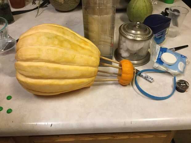 Después de tener todo reunido la calabaza está lista para soporte. Si está parado, eso es genial! Pero si la calabaza es como el mio y parece carecer en el Departamento de balance entonces puede apoyarse contra una pared o tratar de balancear quitando meat(?) extra de calabaza desde el interior.