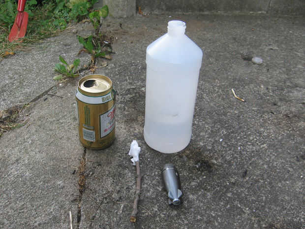 3) ignición. Cualquier cosa que produce fuego y es lo suficientemente larga para que la mano está fuera del camino de la explosión podría funcionar. En mi caso, utilicé un palo con el papel higiénico envuelto alrededor del final y un mechero, porque estaba ejecutando bajo en los partidos.