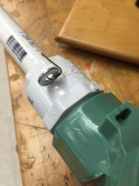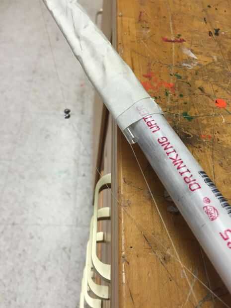 El cañón de la barra está hecho de un tubo de PVC de media pulgada. Este es el tubo que se coloca el proyectil en. Está conectado con el tubo más grande por un adaptador de media pulgada de PVC. Graba una paja a la tómbola que recorren la línea de pesca por lo que no se enrede en cualquiera de los cables o tubos. También pegué una arandela para el adaptador para sujetar el gancho en evitar no gire libremente mientras no esté en uso.