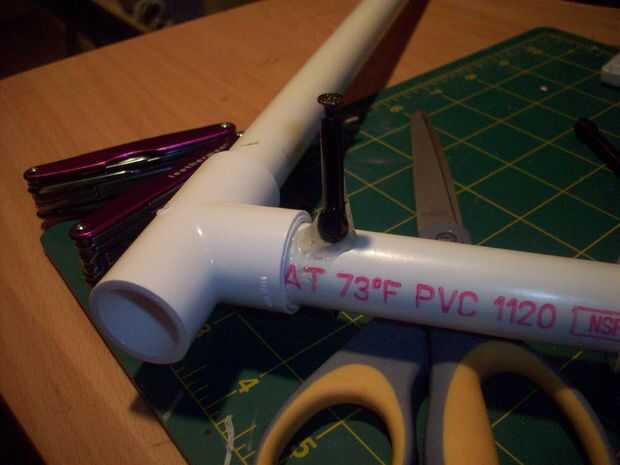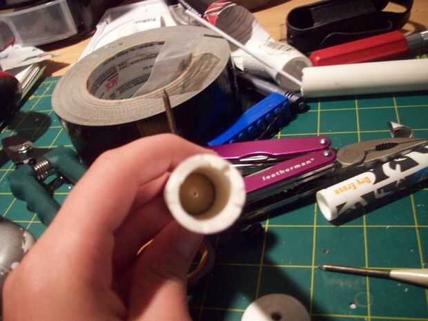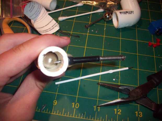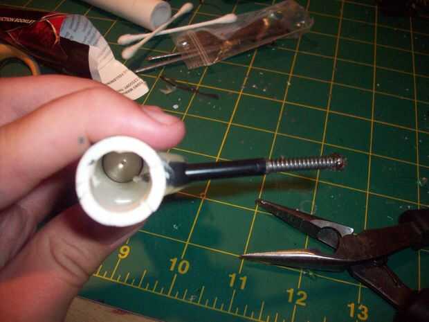 Poco después, descubrí los rodamientos de bolas que vienen en conjuntos de construcción magnética encajan perfectamente en mi rifle de aire de 1/2". Después de una breve investigación comencé diseños rudimentarios clip. La primera fue simplemente una 6" sección de PVC conectado a mi barril con una ' t ' cruce. Esto, sin embargo, permita que muchos rodamientos de bolas caigan en el barril cuando carga al mismo tiempo. Luego perforar un agujero directamente a través de la sección 6" de PVC e inserta un clavo cerca de la parte inferior del clip. He intentado dejar que una bola caiga en un momento moviendo manualmente el clavo, pero que probó fracasado y agravantes.
