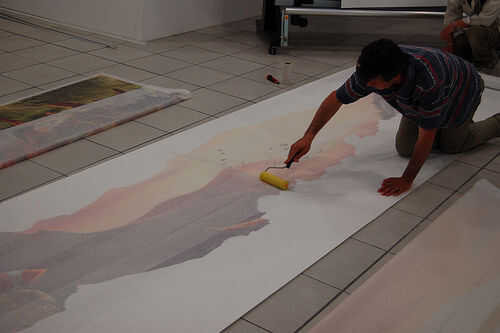 Cualquiér rifilare il decoro (stampato con effetto specchio) al formato richiesto, un filo sul colore se possibile, e piegare una Fisarmónica il telo dal lato del apoyo en tnt, lasciando il lato stampato libero.