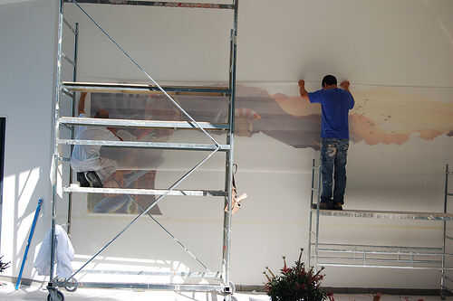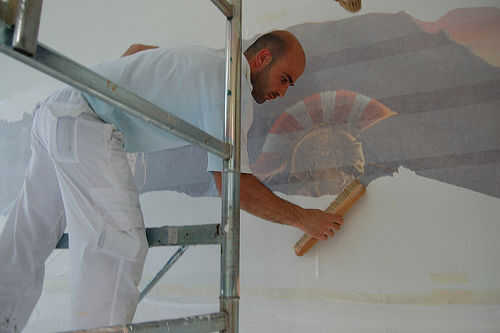 Sulla parete molto bagnata posizionare il telo con il decoro prendendo me dobla usando riferimenti e posizionando il telo una Fisarmónica con tecnica da carta da parati leggera.
