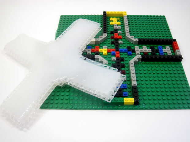 Por lo tanto, me puse a reproducir el proyecto utilizando un material de molde más fácilmente disponibles: LEGOs! El lado positivo es que el proyecto no requiere de una impresora 3D. El lado negativo es que la unidad más pequeña de 1 x 1 "ladrillo LEGO" es considerablemente mayor que la resolución de impresoras 3D de consumo incluso barato - lo que significa que el molde todo robot debe ampliarse, así será mayor el costo del caucho de silicón. También necesita un suministro de aire mucho mayor que la pequeña squeeze bulbos o jeringas utilizadas en el Instructable primera - pero por suerte una bomba de bicicleta, generalmente fácilmente disponible, funciona muy bien.