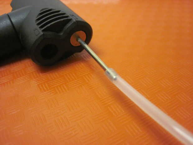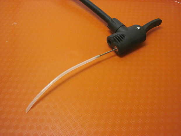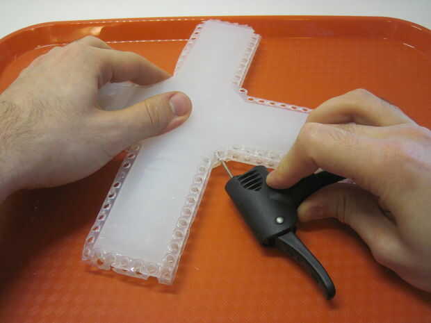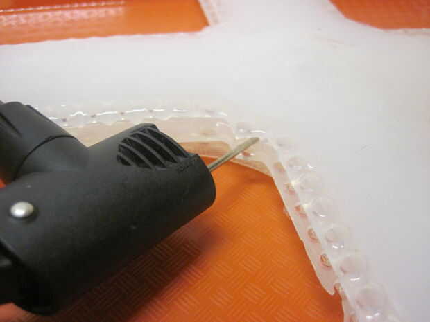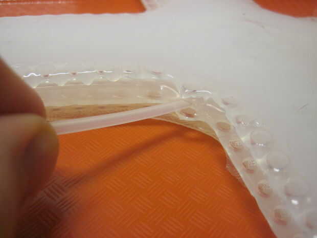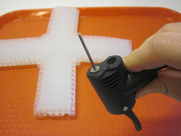 Ahora necesita perforar la pared lateral de tu robot con su línea de suministro de aire y asegúrese de que la punta de la línea alcanza los canales de aire interior. Usted puede hacer esto directamente con un accesorio de aguja para una bomba de bicicleta, pero esto puede ser un poco difícil de manejar ya que la manguera conectada a la moto es algo grueso y no muy flexibles. Importante: no haga más de un orificio en el robot de! Esto causará una fuga - si la línea de suministro de aire se cae o necesita empezar de nuevo, asegúrese de que volver a utilizar la misma bodega. Puede ser más fácil ver si tienes el robot hasta una luz brillante, ya curado Ecoflex es ligeramente translúcido.