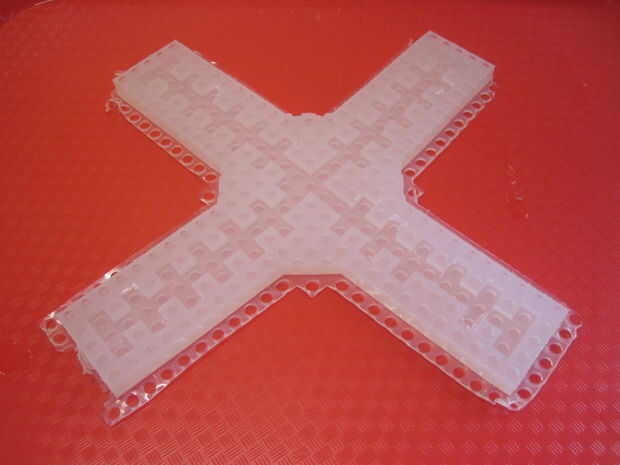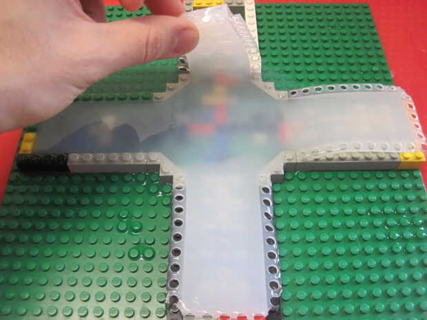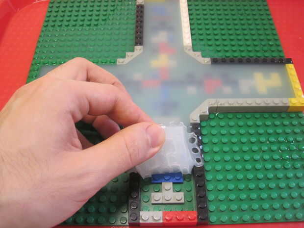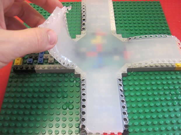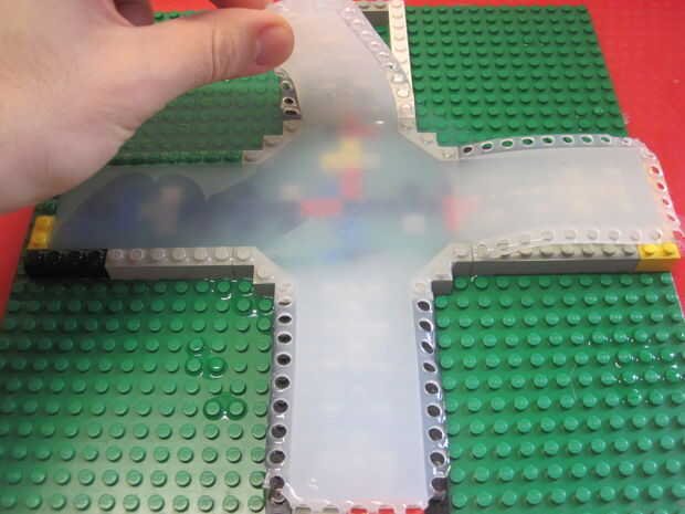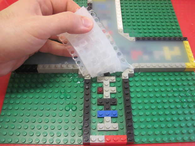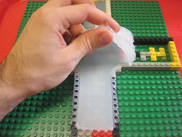 a partir de los bordes exteriores, pelar cuidadosamente la capa superior del molde. EcoFLEX es bastante resistente y elástica, por lo que no necesita preocuparse demasiado acerca de romperlo, pero no hace daño para tener cuidado. Debe ser capaz de ver los canales de aire en la parte inferior del molde claramente - Asegúrese de que ninguna de las placas pequeñas de LEGO se atascó en ellos.