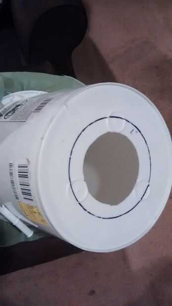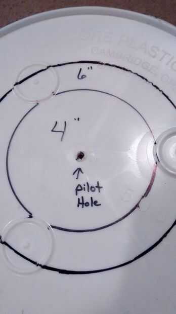 El centro está marcado ya hacia fuera de la fábrica. Hice 2 marcas, una para un círculo de 4 pulgadas y otra para un círculo de 6 pulgadas. Lo hice en caso de 4 pulgadas no era lo suficientemente grande, y después había cortado, no tengo un centro de un agujero de 6 pulgadas. 4 pulgadas funcionaba bien!