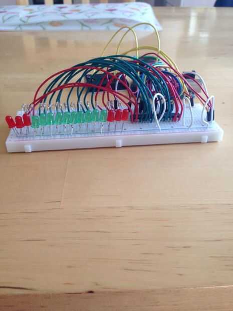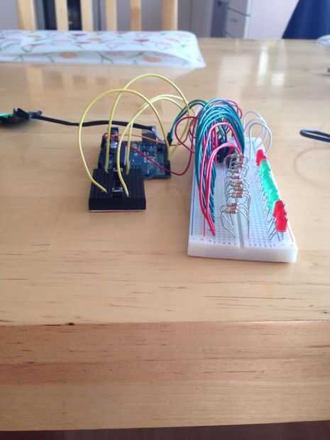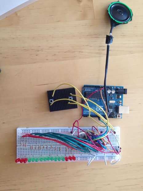 Este es un juego de airhockey/pong que hemos creado en la escuela. Es un proyecto sencillo para principiantes. Contamos con 16 LED en el orden 3 leds rojo - LED verde 10 - 3 leds de color rojo. Entonces tenemos 2 botones. El juego funciona así: