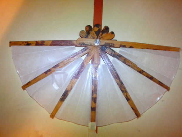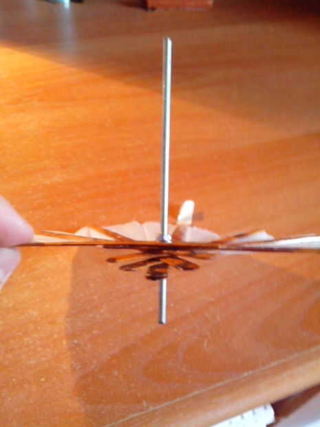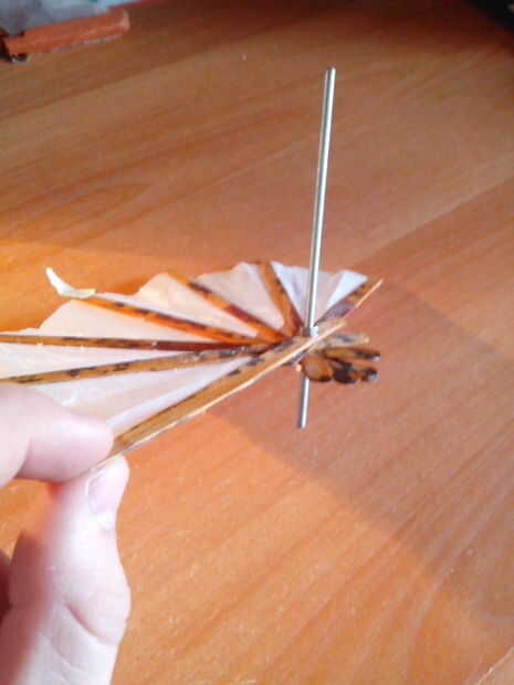 Herhaal hetzelfde principe als bij de vleugel maar knip de stokjes van de waaier en 2 zodat je een kleiner geheel bekomt.