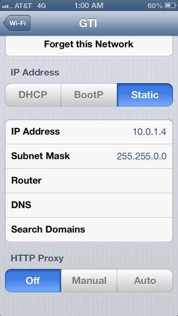 Para su teléfono para conectarse al Airplay de la red y la internet a través de su compañía de teléfono, usted tendrá que cambiar una configuración en el teléfono. Si tienes un iPhone, conectar a la red inalámbrica nueva y entrar en la configuración de esa red. Elige "Estática" bajo la dirección IP.