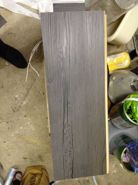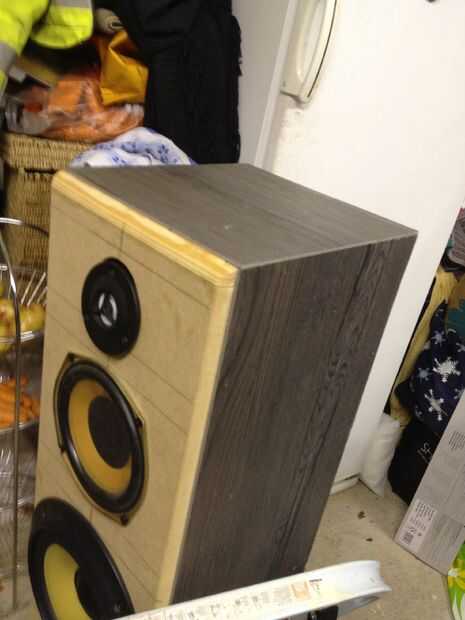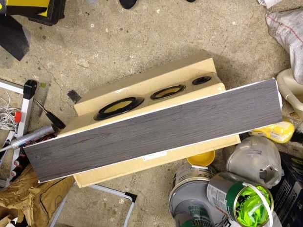 > Para acabar con los altavoces usé tablas de piso de vinilo auto-adhesivo (efecto madera gris plata) y había pegado a los lados y parte superior de las unidades. Usé varias cuchillas para cortar los tablones del vinilo a la medida después de que se han adherido. Esto fue una gran manera fácil cubrir los altavoces.