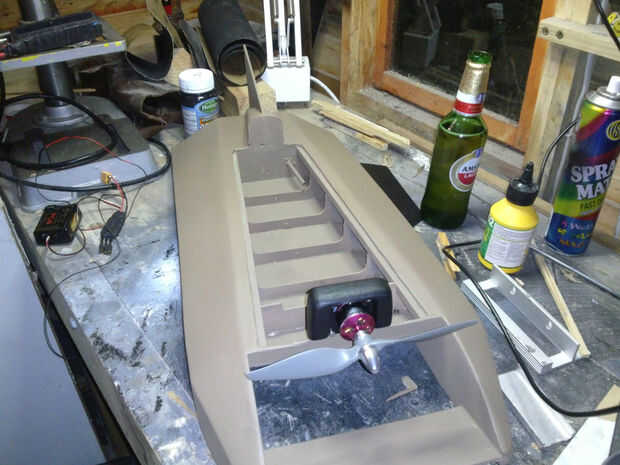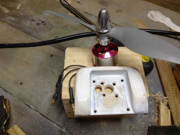 El montaje final era una simple pieza en forma de L de aluminio doblado con unos 10 grados de inclinación para arriba y lo suficientemente alto como para montar una hélice de 10 pulgadas. Simple y efectivo, pero bastante feo. Si construí el barco otra vez sería ajustar el fuselaje para montar una hélice más grande en la nariz.