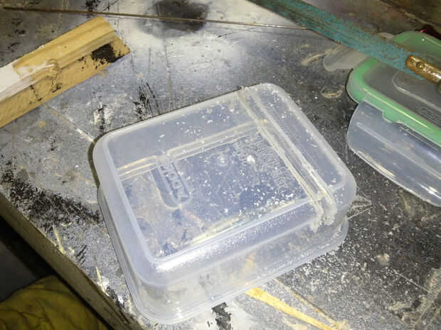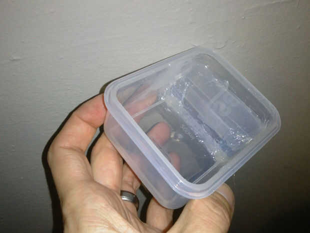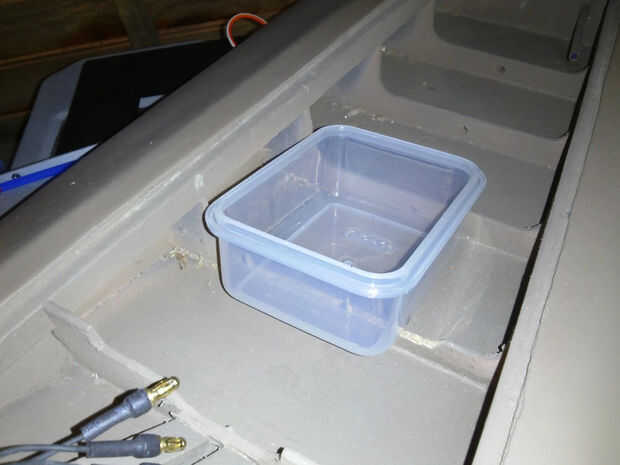 Encontré la bañera cierre snap "tupperware" más pequeño que pude encontrar. Por desgracia, es demasiado alto para caber en el barco, así que sólo cortar una ranura en él (con una sierra de mano) y luego cerrarse herméticamente con plástico caliente del pegamento y de desecho.