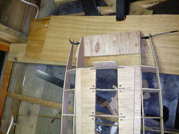 Hay probablemente mejores formas para doblar la madera contrachapada, he leído acerca de los métodos que utilizan vapor, otros que utilizan amoníaco (particularmente ventana limpieza vaporizador), pero acabo de ir sencilla. He utilizado bridas para tire la madera en un poco más cada día que trabajaba en el barco. Una vez los lados habían sido doblados suficientemente perforaron orificios de 1,5 mm y utiliza alambre de cobre para sostenerlos en su lugar mientras pegan.
