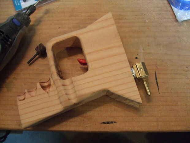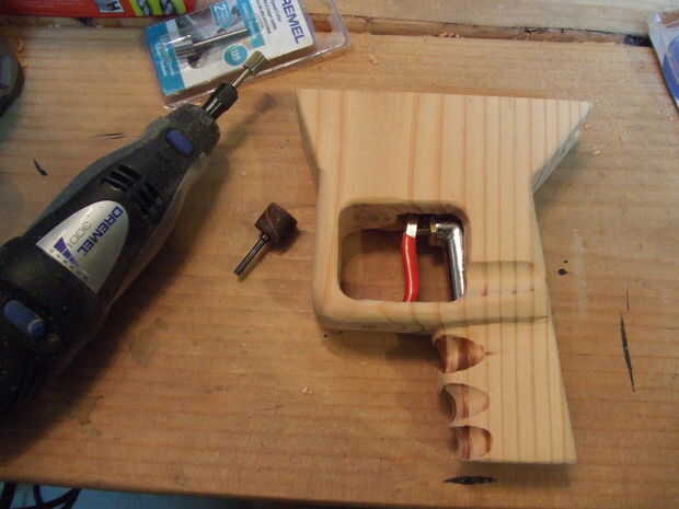 4. usando una broca de 1/2 pulgada y la Dremel con una broca router cortando un espacio dentro de la empuñadura para el mecanismo de disparo de alta velocidad