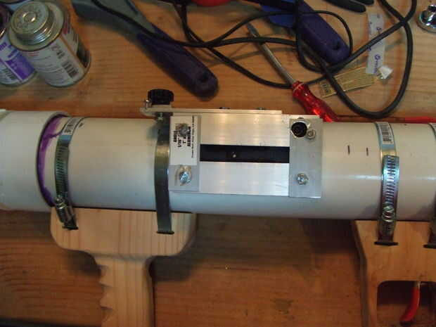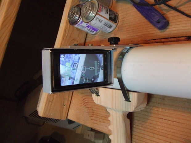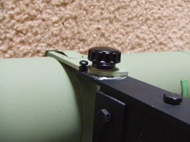 Usé 1/16 barra de L de aluminio para el marco externo y barra de aluminio de 1/8 para la bisagra y montaje para el cañón. La pieza unida al cañón simplemente tiene una ranura de corte en ella para una de las bandas de tubo para pasar a través. El teléfono es un dispositivo de repuesto Droid 2 que tenía alrededor y la app que utilizo es llamado Geo Cam allí es una versión gratis y de pagada. El teléfono es velcro para el montaje. La bisagra es un perno especial que encontré en Lowe que tiene el mando en la parte superior y es un tornillo #10. He añadido una arandela y tuercas. Puse un tornillo pequeño en la barra fijada al cañón y Dremel corta una pequeña muesca en la barra fijada a la vista para que se detenga la bisagra recta abierta. Taladré un agujero para la cámara ver a través.