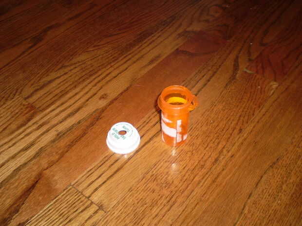 Taladrar un agujero en la parte superior de la tapa de la botella de píldora. Asegúrese de que la paja se adapta en lo bueno.