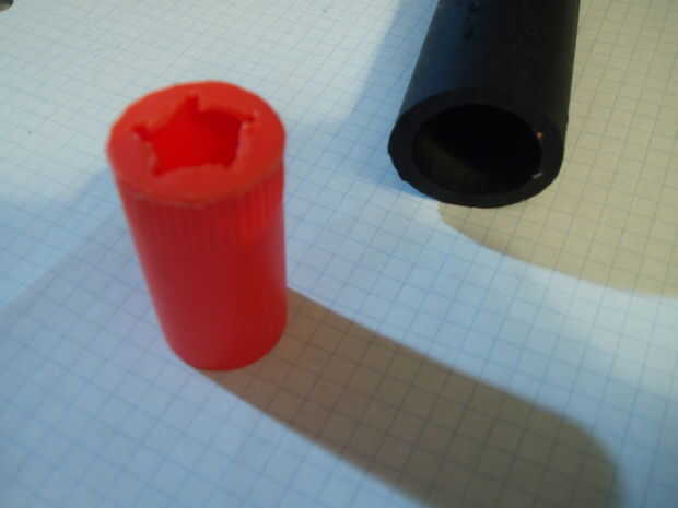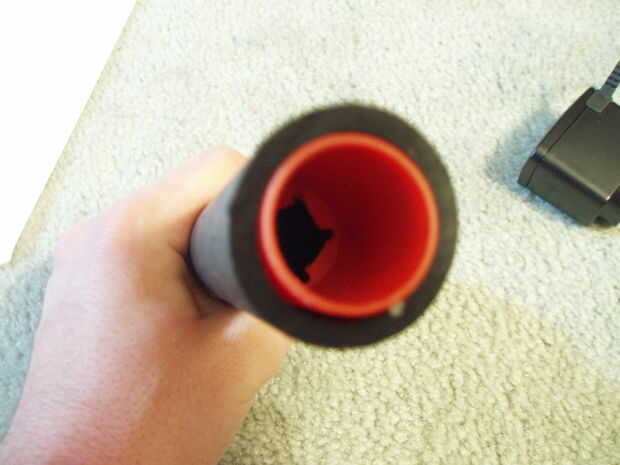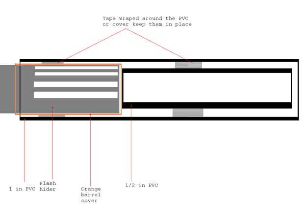 Se trata de un silenciador falso muy simple que puede utilizarse para cubrir un barril más largo, o simplemente para las miradas. Simplemente corte un agujero lo suficientemente grande como para un BB (o barril) pasar a través en una de esas tapas de barril naranja que vienen con muchos AEGs. Ahora cortar el 1 en PVC a la longitud que desee su escape al ser y deslícelo sobre la tapa del barril. Si el ajuste está suelto, envuélvalo con cinta un par de veces. Puede Agregar un barril interno cortando un trozo de 1/2 en PVC que es la longitud de su silenciador menos la longitud de la cubierta del barril y envuelva en cinta hasta que permanecerá en el 1. PVC. El contraprion todo debe encajar en el hider de destello por la fricción de la misma forma la tapa del barril. Pintarlo como quieras.