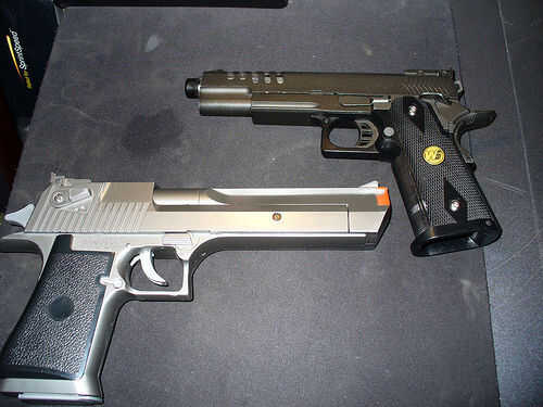 Tengo una vieja pistola de resorte de Desert Eagle (sin marca), una variante de Wei-Tech(WE) 1911 y un trabajos de Kuan Ju (KJW) Sig P229. El que es decente airsofters lo suficiente, pero muchos van para el japonés hecho de armas, Tokio Marui hace muy buenas pistolas y armas occidental (WA) hace armas de alta calidad que mucha gente no piensa jugar con. Los fabricantes japoneses sin embargo generalmente utilizan diapositivas de plástico, China co suelen utiliza metal, lo que significa que pueden tomar presiones más altas.